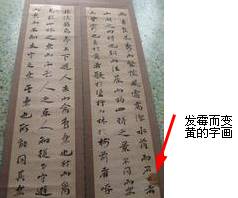 3):被損壞的字畫裝裱修復(fù)后必須放入專用防霉片,因為修復(fù)后在裝裱前的字畫已長霉菌,給霉菌留下了滋生源,雖然表面上我們已除霉菌,但用顯微鏡觀看還會留下大量的霉菌,因霉腐菌繁殖相當(dāng)快,如不放入防霉片會會造成字畫更快的加速生長面第二次發(fā)霉。